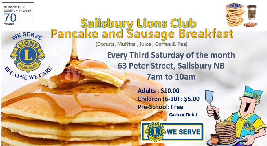 Saturday February 21st is our Lions Club Pancake and Sausage Breakfast (Donuts, Muffins , Juice , Coffee & Tea) … Hope to see you there .. 63 Peter Street Salisbury NB