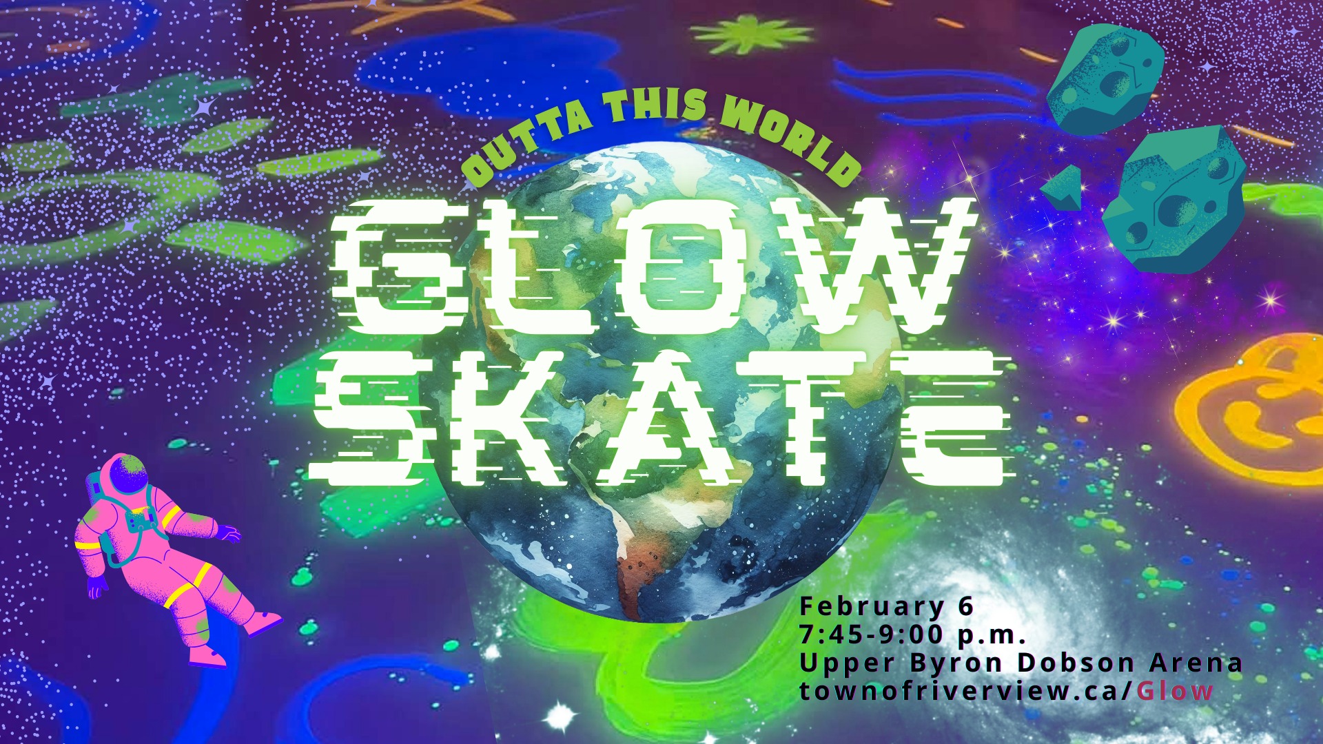 Event by Active Riverview and Town of Riverview 90 Biggs Dr, Riverview, NB E1B, Canada Duration: 3 hr Celebrate Riverview Winter Carnival by attending one of two 'Outta This World' family-friendly glow skates at: 6:00-7:30 p.m.or7:45-9:00 p.m. Enjoy skating under dazzling glow lights, vibrant neon colors, and themed music in a welcoming, family-friendly, all ages atmosphere. Whether you're gliding around the rink or just enjoying the space decor, it’s the perfect way to make memories and bond with loved ones Please note: CSA…