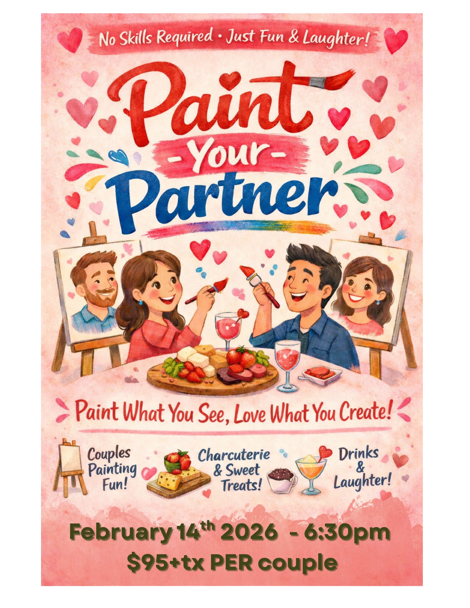 Event by Magnetic Hill Community Center 3348 Route 126, Moncton, NB, Canada Paint Your Partner : Valentine’s Day No art skills required — just love, laughter, and a little paint. Enjoy charcuterie, and a guided paint experience where you create a portrait of the person across from you.Perfectly imperfect. Just like love. • 2 canvases + supplies• Guided experience• Charcuterie for two• Non-alcoholic drinks