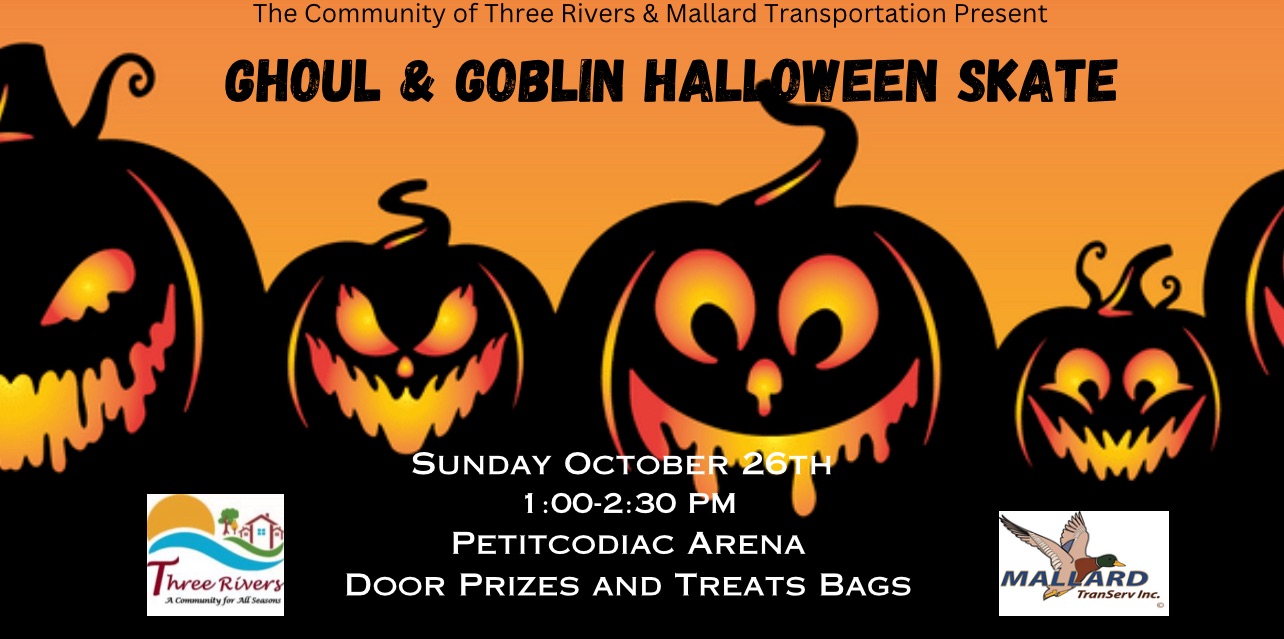 Event by The Community of Three Rivers Recreation 43 Corey Ave, Petitcodiac, NB E4Z 4G3 Come prepared in your Halloween Costume to skate around with your local ghouls and goblins, enter your name for raffle gift cards to local businesses and take home a treat bag.