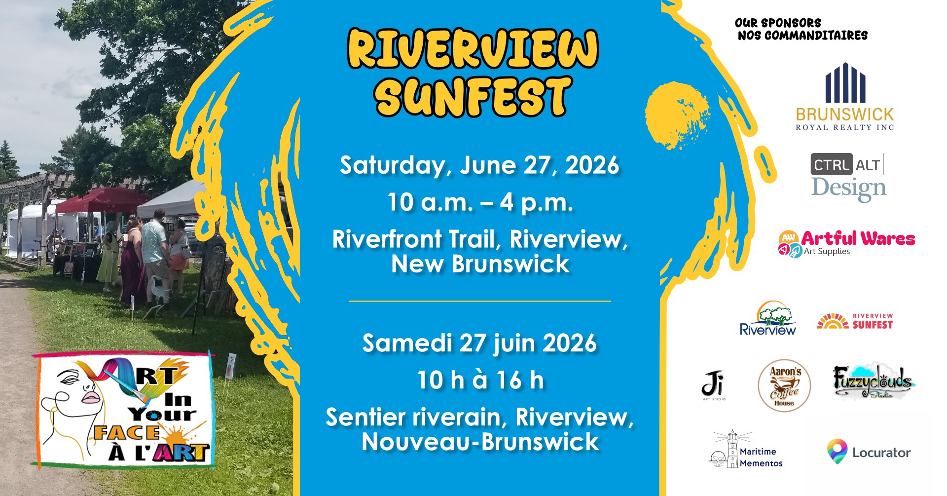Event by Art In Your Face / Face à l'art - Art Show / Expo d'art Riverview Riverfront Trail Duration: 6 hr Join us for Art In Your Face — our biggest outdoor art event of the year! (This is happening, Rain or shine everyone!!) This vibrant outdoor art event is part of Riverview Sunfest and brings together talented local artists for a full day of creativity, colour, and community. Artists will be set up with their own pop-up shops, showcasing original…